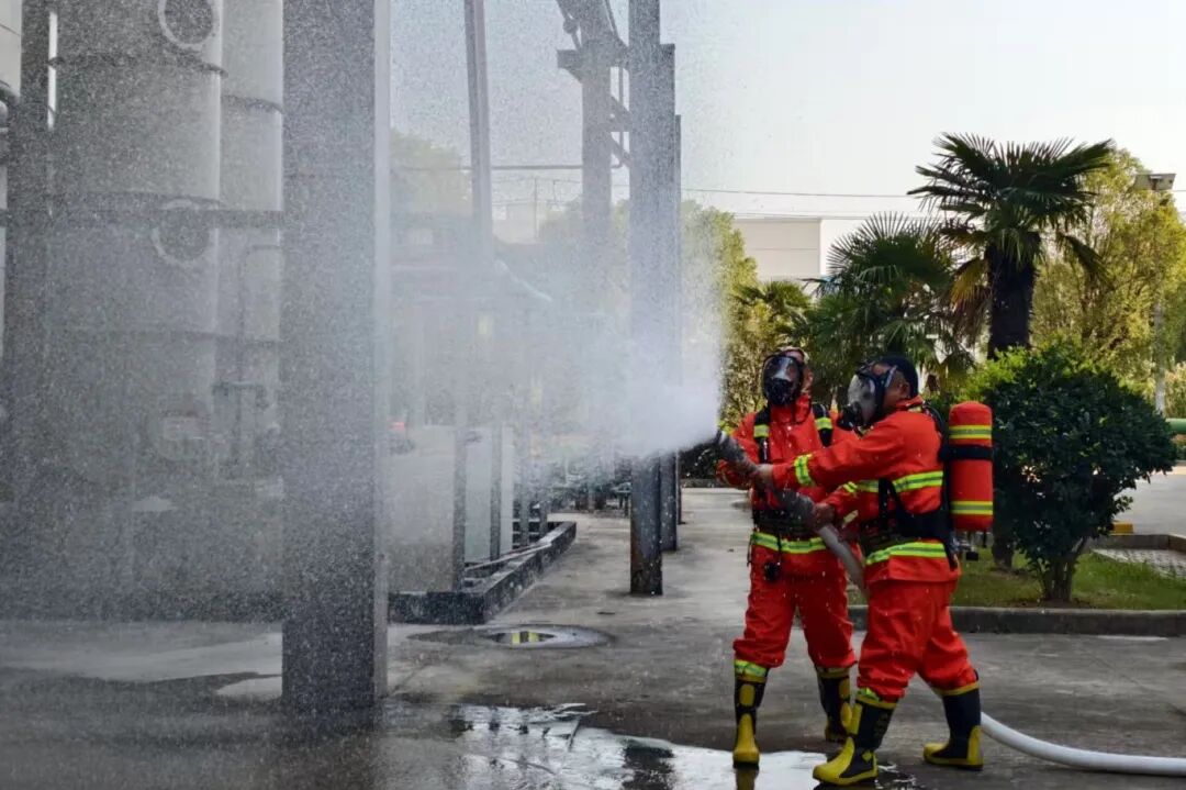 本次演練模擬了股份公司二車間C5區域乙醇管道泄漏起火事件,完整呈現了從隱患發現到險情升級的全過程。當班人員發現乙醇管道法蘭泄漏,在緊急處置過程中因靜電引發“火情”;班長立即組織初期滅火與人員疏散,車間主任隨即啟動車間級應急預案并上報公司;公司消控中心接報后,總指揮牛犇研判險情,果斷下令啟動公司級危險化學品事故綜合應急預案,并任命現場應急指揮長;治安保衛、搶險救援、醫療救護等各應急小組迅速響應,高效完成現場警戒、工藝隔離、人員清點等關鍵任務。當“火勢”呈現蔓延趨勢時,現場指揮部立即向邗江區消防救援大隊報警求援,順利完成指揮權交接與現場技術交底;企消雙方緊密協同,迅速撲滅明火,成功處置險情。整個流程環環相扣,有效檢驗了應急響應機制的靈敏性與協同作戰能力。